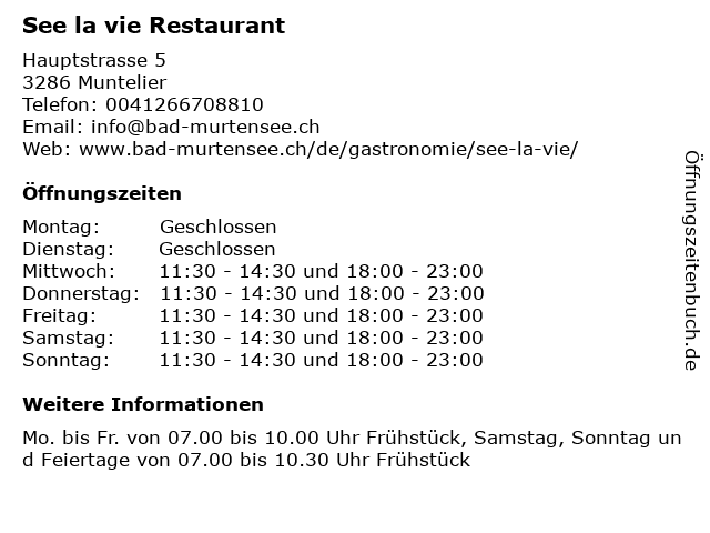 | Öffnungszeiten See la vie Restaurant in Muntelier anzeigen | |