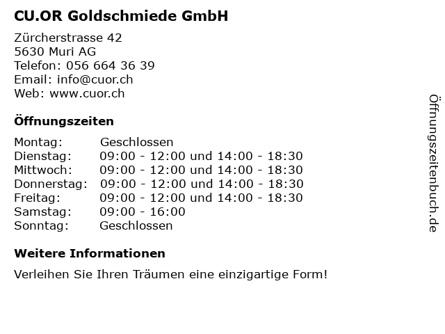 | Öffnungszeiten CU.OR Goldschmiede GmbH in Muri AG anzeigen | |