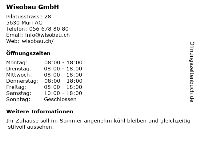 | Öffnungszeiten Wisobau GmbH in Muri AG anzeigen | |
