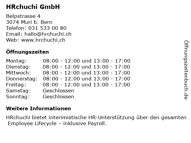 | Öffnungszeiten HRchuchi GmbH in Muri b. Bern anzeigen | |