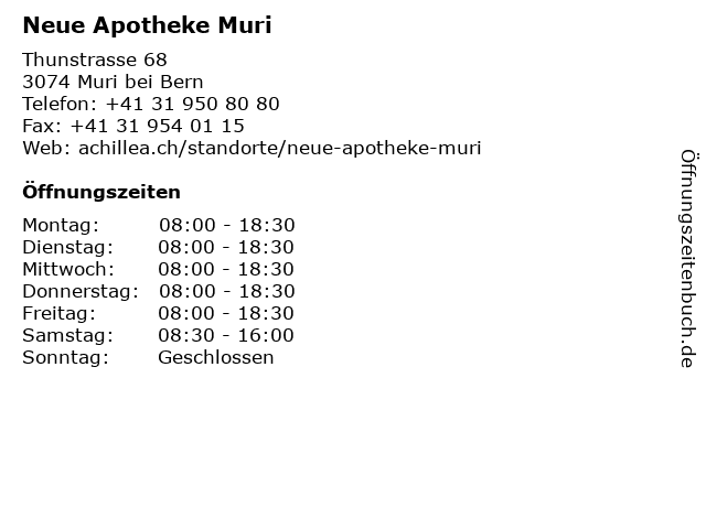 | Öffnungszeiten Neue Apotheke Muri in Muri bei Bern anzeigen | |