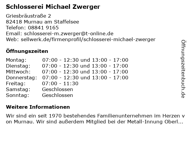 1 Schlosserei Michael Zwerger, Inhaber Michael Zwerger Junior (Entfernung: 0,01 km) Griesbräustrasse 2, 82418 Murnau 6 |