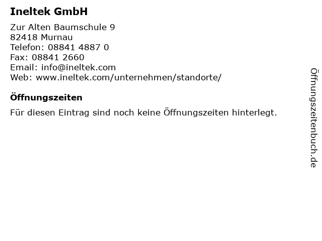 | Öffnungszeiten Ineltek GmbH in Murnau anzeigen | |