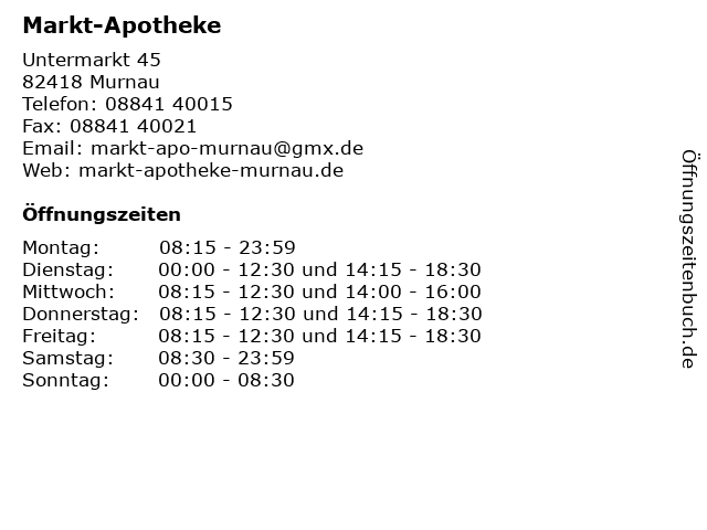 | Öffnungszeiten Markt-Apotheke in Murnau anzeigen | |