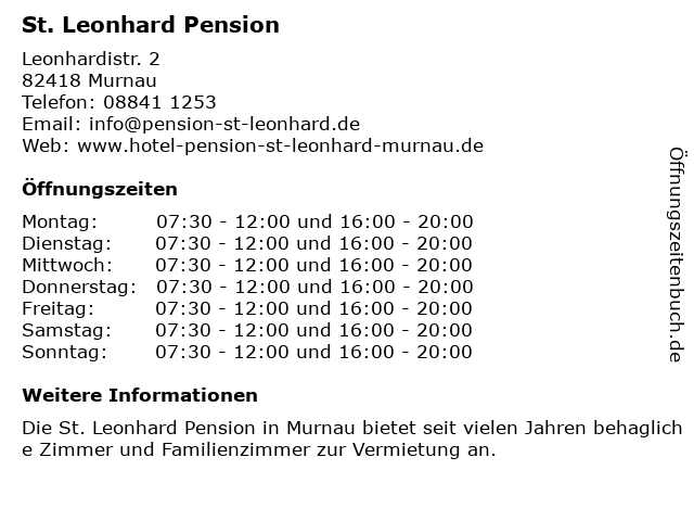 | Öffnungszeiten St. Leonhard Pension in Murnau anzeigen | |