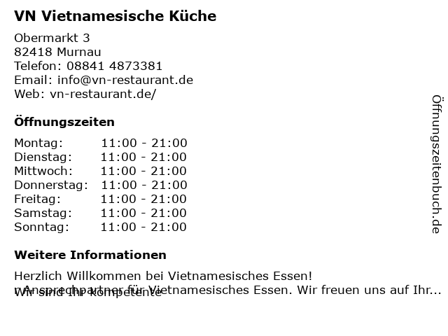 | Öffnungszeiten VN Vietnamesische Küche in Murnau anzeigen | |