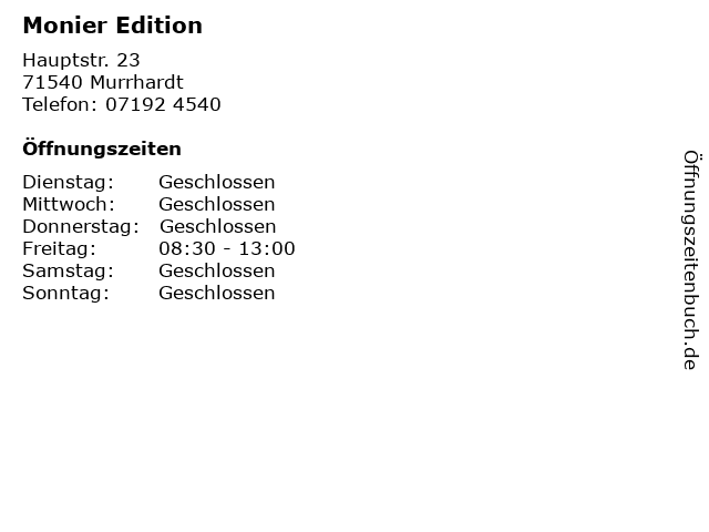 | Öffnungszeiten Monier Edition in Murrhardt anzeigen | |