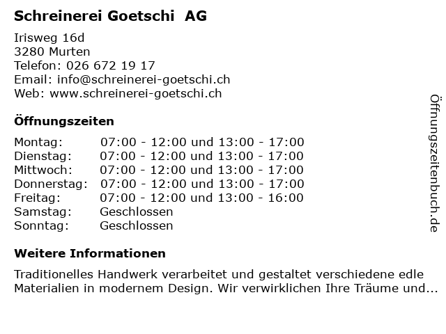 | Öffnungszeiten Schreinerei Goetschi AG in Murten anzeigen | |