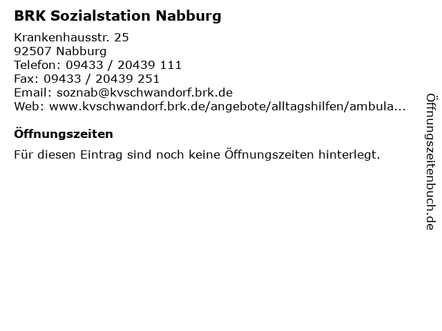 | Öffnungszeiten BRK Sozialstation Nabburg in Nabburg anzeigen | |