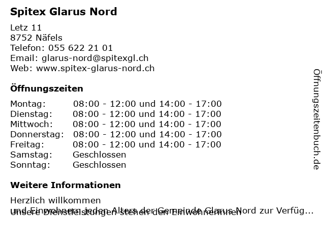 | Öffnungszeiten Spitex Glarus Nord in Näfels anzeigen | |