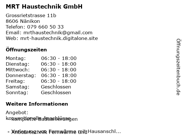 | Öffnungszeiten MRT Haustechnik GmbH in Nänikon anzeigen | |
