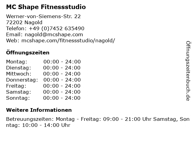 | Öffnungszeiten MC Shape Fitnessstudio in Nagold anzeigen | |