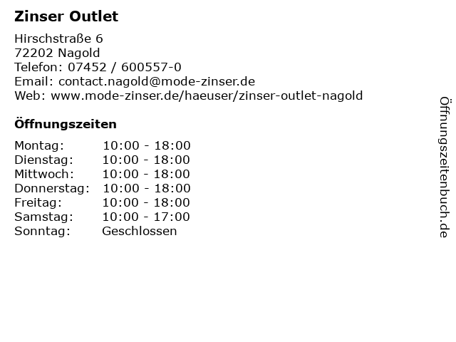 | Öffnungszeiten Zinser Outlet in Nagold anzeigen | |