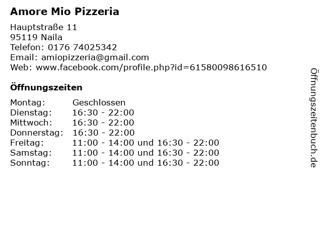 | Öffnungszeiten Amore Mio Pizzeria in Naila anzeigen | |