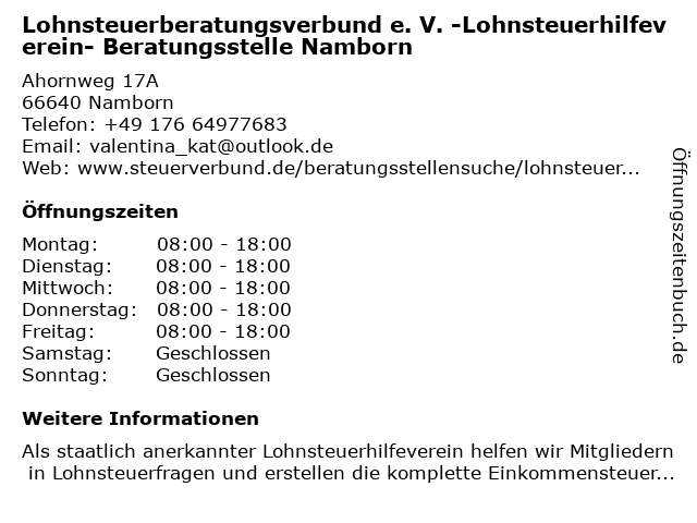 Branchen & Suchbegriffe zu Lohnsteuerberatungsverbund e. V. -Lohnsteuerhilfeverein- Beratungsstelle Namborn:beratungsstelle, e., einkommensteuererklärung, lohnsteuerberatungsverbund, lohnsteuererklärung, lohnsteuerhilfe namborn, lohnsteuerhilfeverein, lohnsteuerhilfeverein namborn, lohnsteuerjahresausgleich, namborn, steuerberater, steuererklärung, steuerhilfe, steuerverbund, v. |