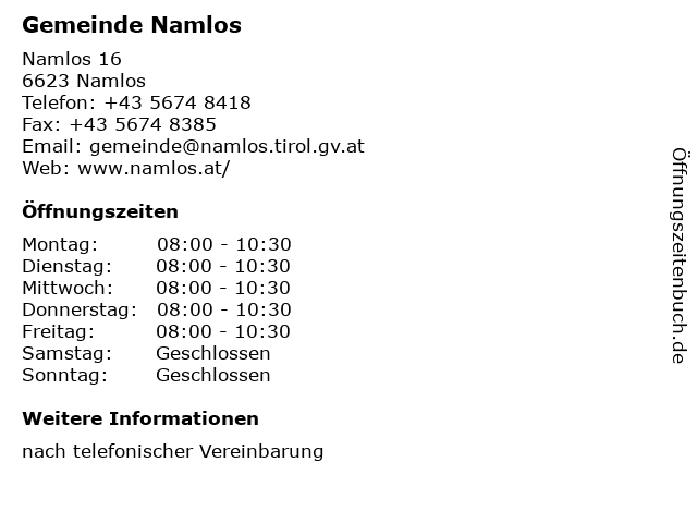 | Öffnungszeiten Gemeinde Namlos in Namlos anzeigen | |
