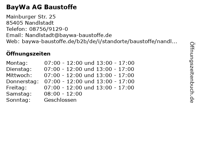 | Öffnungszeiten BayWa AG Baustoffe in Nandlstadt anzeigen | |
