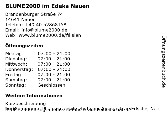 | Telefonnummer BLUME2000 im Edeka Nauen in Nauen (+49 40 52868158) anrufen | |