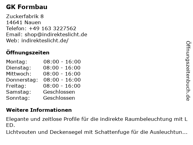 | Öffnungszeiten GK Formbau in Nauen anzeigen | |