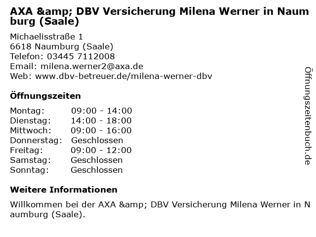 1 AXA Versicherung- Hauptvertretung Ronald Pietsch (Entfernung: 0,18 km) Michaelisstraße 81, 06618 Naumburg 5 6 DBV Deutsche Beamtenversicherung Fuchs & Leuchtenberger oHG in Halle (Saale) (Entfernung: 37,62 km) Pfannerhöhe 33, 06110 Halle (Saale) |