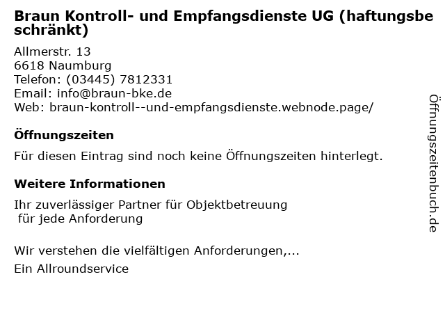 | Braun Kontroll- und Empfangsdienste UG (haftungsbeschränkt) anrufen | |
