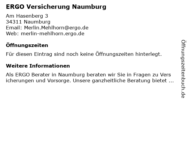 | Öffnungszeiten ERGO Versicherung Naumburg in Naumburg anzeigen | |