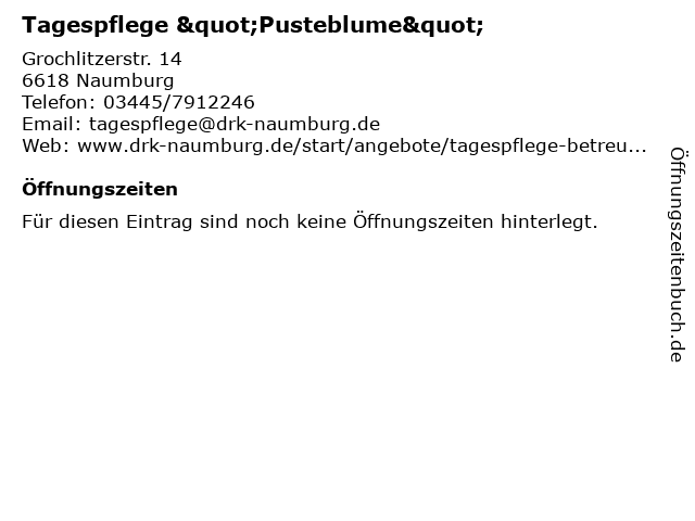 | Öffnungszeiten Tagespflege "Pusteblume" in Naumburg anzeigen | |