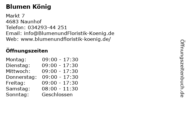 | Öffnungszeiten Blumen König in Naunhof anzeigen | |