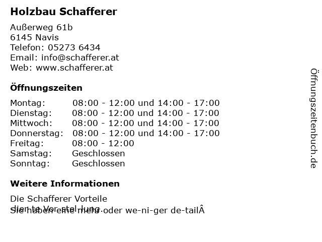 | Öffnungszeiten Holzbau Schafferer in Navis anzeigen | |