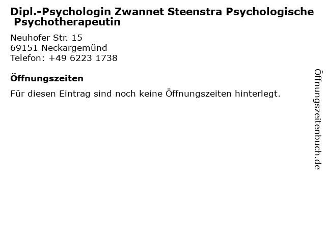 | Dipl.-Psychologin Zwannet Steenstra Psychologische Psychotherapeutin anrufen | |