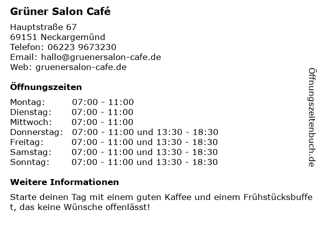 | Öffnungszeiten Grüner Salon Café in Neckargemünd anzeigen | |