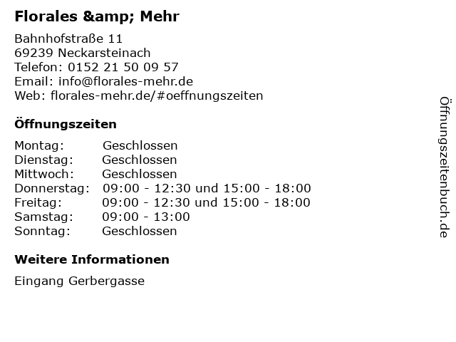 | Öffnungszeiten Florales & Mehr in Neckarsteinach anzeigen | |