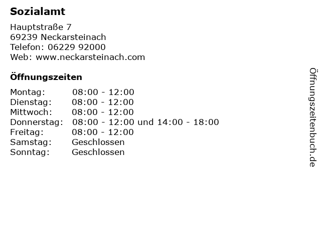 | Öffnungszeiten Sozialamt in Neckarsteinach anzeigen | |