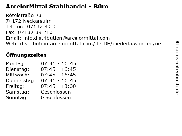 2 Stahlhandel Haug / Öffnungszeiten Stahllager (Entfernung: 6,59 km) Hanns-Martin-Schleyer-Straße 5, 74177 Bad Friedrichshall 3 Stahlhandel Haug / Öffnungszeiten Handwerkertheke (Entfernung: 6,59 km) Hanns-Martin-Schleyer-Straße 5, 74177 Bad Friedrichshall 4 Stahlhandel Haug GmbH + Co. KG - Büro (Entfernung: 6,59 km) Hanns-Martin-Schleyer-Str. 5, 74177 Bad Friedrichshall 6 Artinger Stahlrohr GmbH & Co. KG Stahlhandel (Entfernung: 18,26 km) Daimlerstraße 15, 74389 Cleebronn |