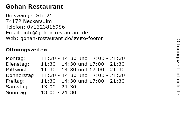 | Öffnungszeiten Gohan Restaurant in Neckarsulm anzeigen | |