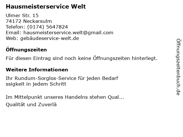 | Öffnungszeiten Hausmeisterservice Welt in Neckarsulm anzeigen | |