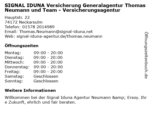 1 SIGNAL IDUNA Versicherung Sena Ersoy - Versicherungsagentur (Entfernung: 0,00 km) Hauptstr. 22, 74172 Neckarsulm 3 SIGNAL IDUNA Versicherung Yusuf Zeyrek - Versicherungsagentur (Entfernung: 5,03 km) Hauptstr. 53, 74235 Erlenbach 6 |
