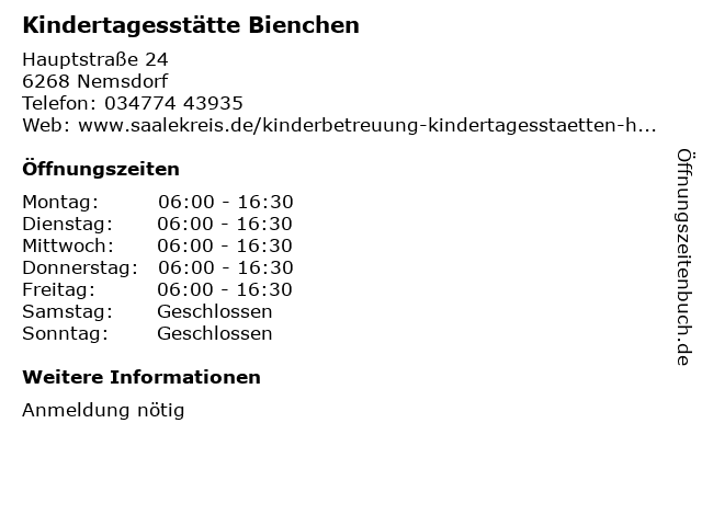 | Öffnungszeiten Kindertagesstätte Bienchen in Nemsdorf anzeigen | |