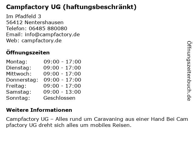 Branchen & Suchbegriffe zu Campfactory UG (haftungsbeschränkt):anhängerwerkstatt, autowerkstatt, campfactory, geschäft für wohnmobilzubehör, haftungsbeschränkt, kaufhaus, ug, wohnmobilreparatur, wohnmobilvermietung |