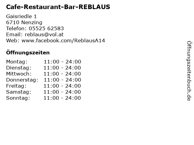 | Öffnungszeiten Cafe-Restaurant-Bar-REBLAUS in Nenzing anzeigen | |