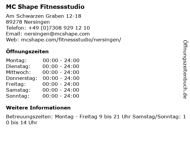 | Öffnungszeiten MC Shape Fitnessstudio in Nersingen anzeigen | |