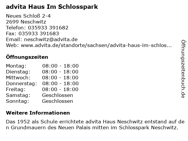 | Öffnungszeiten advita Haus Im Schlosspark in Neschwitz anzeigen | |