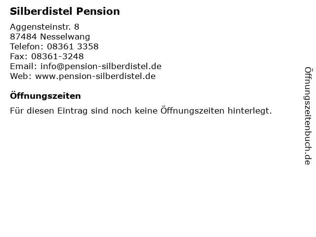 | Öffnungszeiten Silberdistel Pension in Nesselwang anzeigen | |