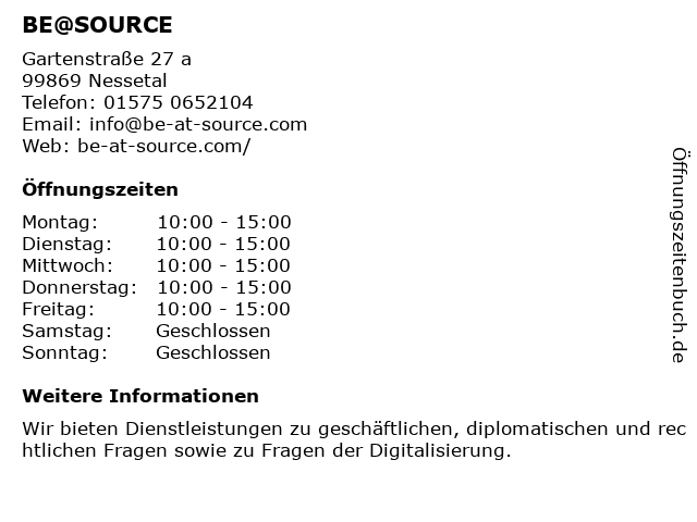 | Öffnungszeiten BE@SOURCE in Nessetal anzeigen | |