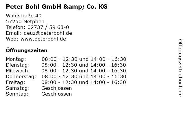 | Öffnungszeiten Peter Bohl GmbH & Co. KG in Netphen anzeigen | |