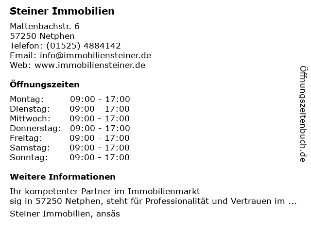 | Öffnungszeiten Steiner Immobilien in Netphen anzeigen | |