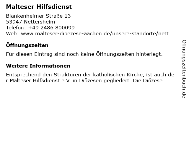 | Öffnungszeiten Malteser Hilfsdienst in Nettersheim anzeigen | |