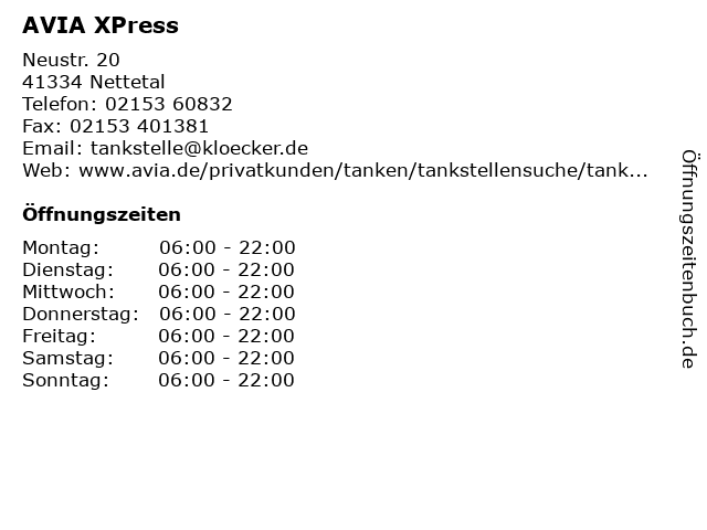 | Öffnungszeiten AVIA XPress in Nettetal anzeigen | |