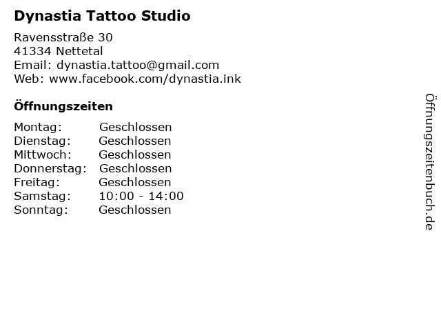 | Öffnungszeiten Dynastia Tattoo Studio in Nettetal anzeigen | |