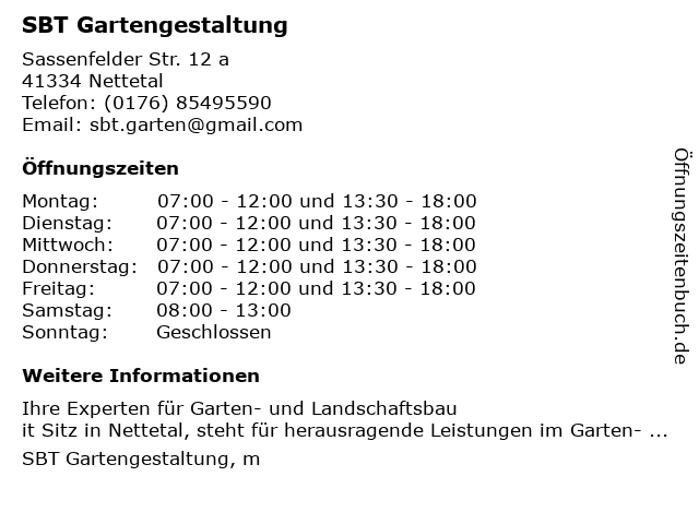| Öffnungszeiten SBT Gartengestaltung in Nettetal anzeigen | |
